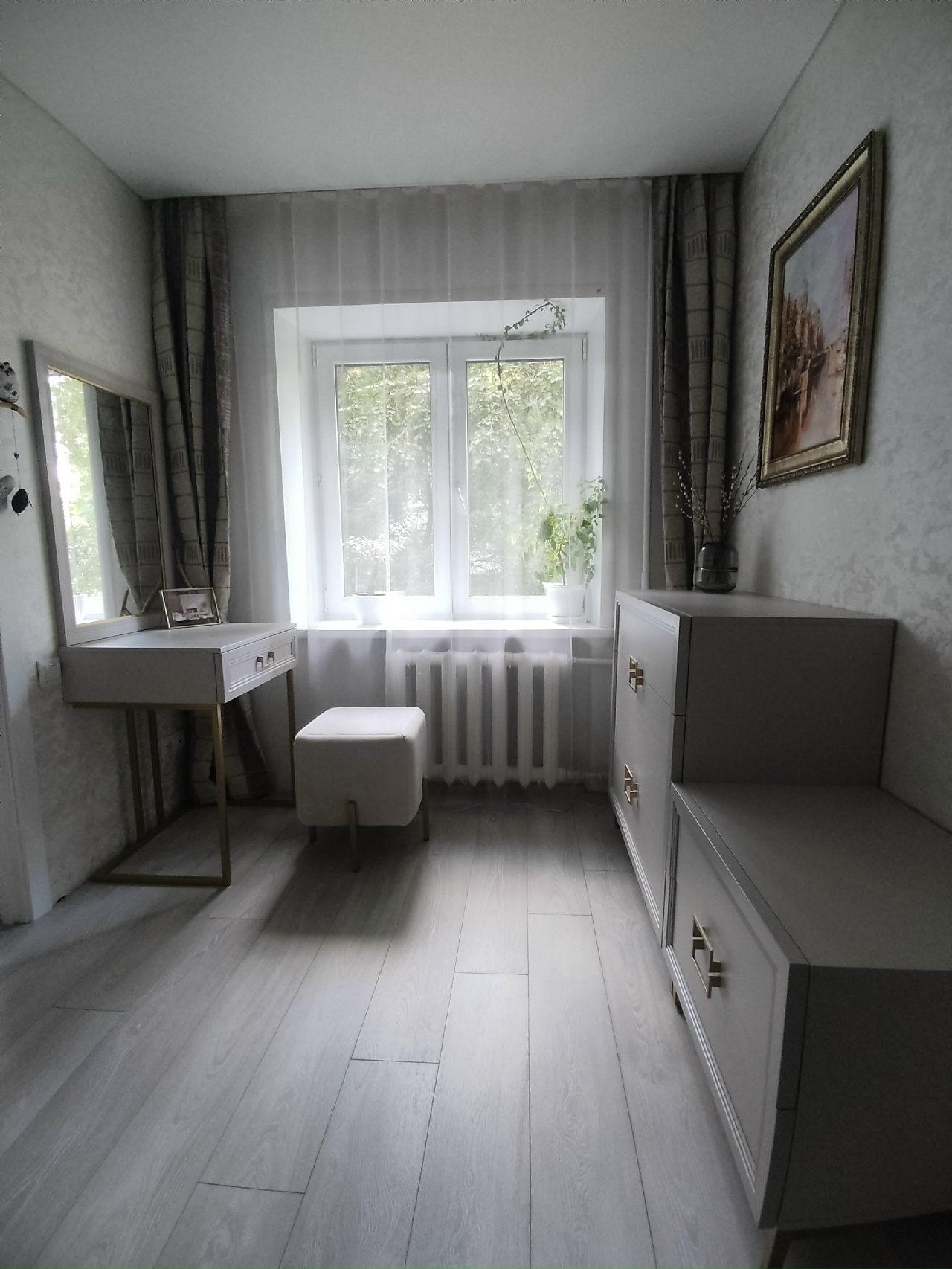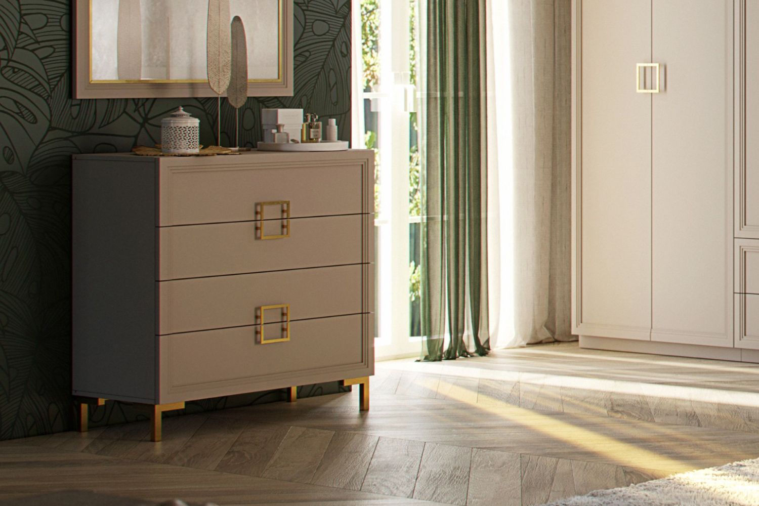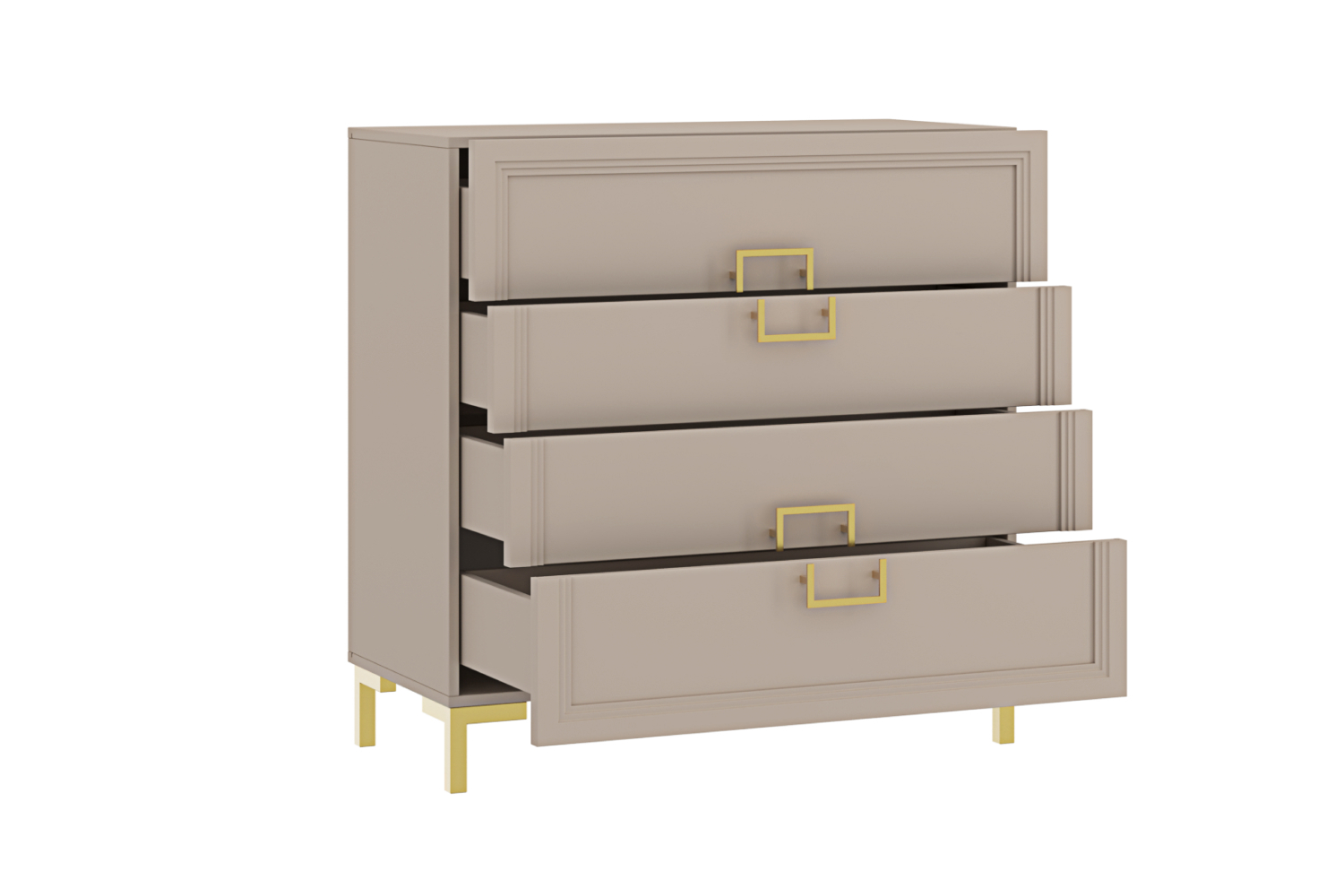 Элегантный лаконичный комод с четкими прямыми линиями будет превосходно смотреться в спальне, гостиной, прихожей, оформленной в стиле ар-деко или минимализм. Четыре выдвижных ящика визуально объединены рисунком квадратных ручек. Изящный сложный оттенок «серый кашемир», фурнитура и опоры «под золото» только усиливают эффектность мебели.