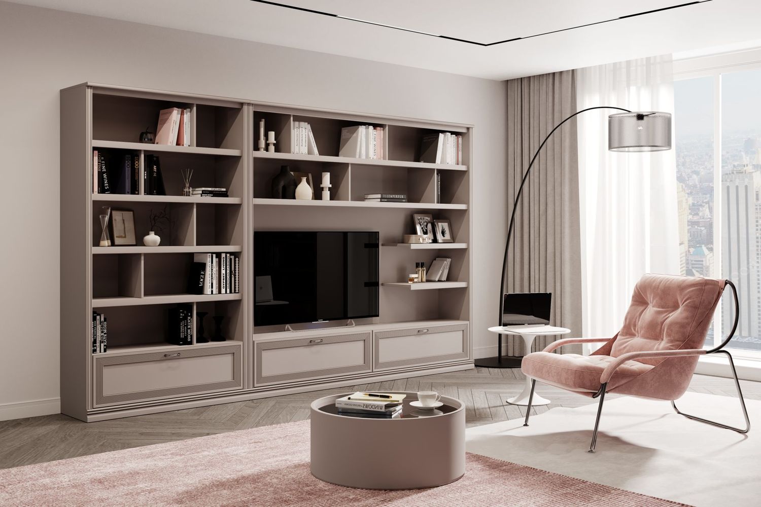 - Верхняя секция отрытая с полками из ЛДСП, на которых декоративный профиль. Могут быть в лево-/правостороннем исполнении;