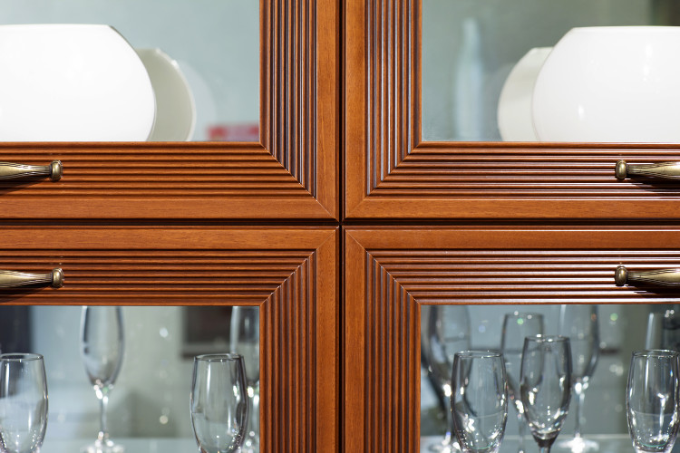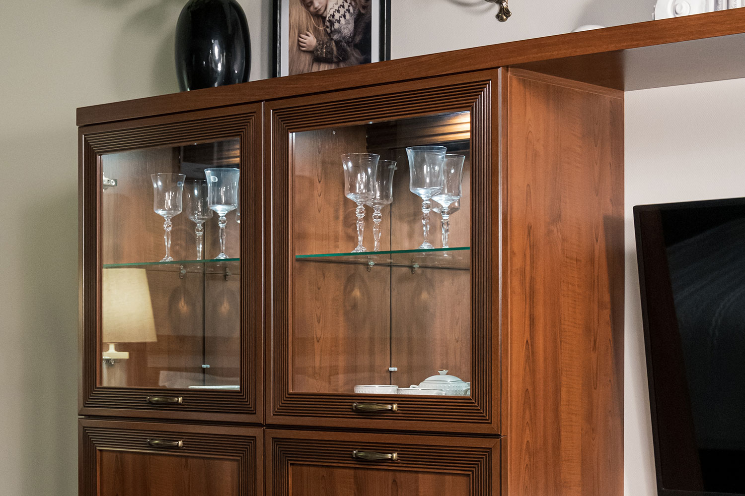 - На задних стенках шкафов со стеклянными вставками есть зеркала. Это помогает зрительно расширить комнату.